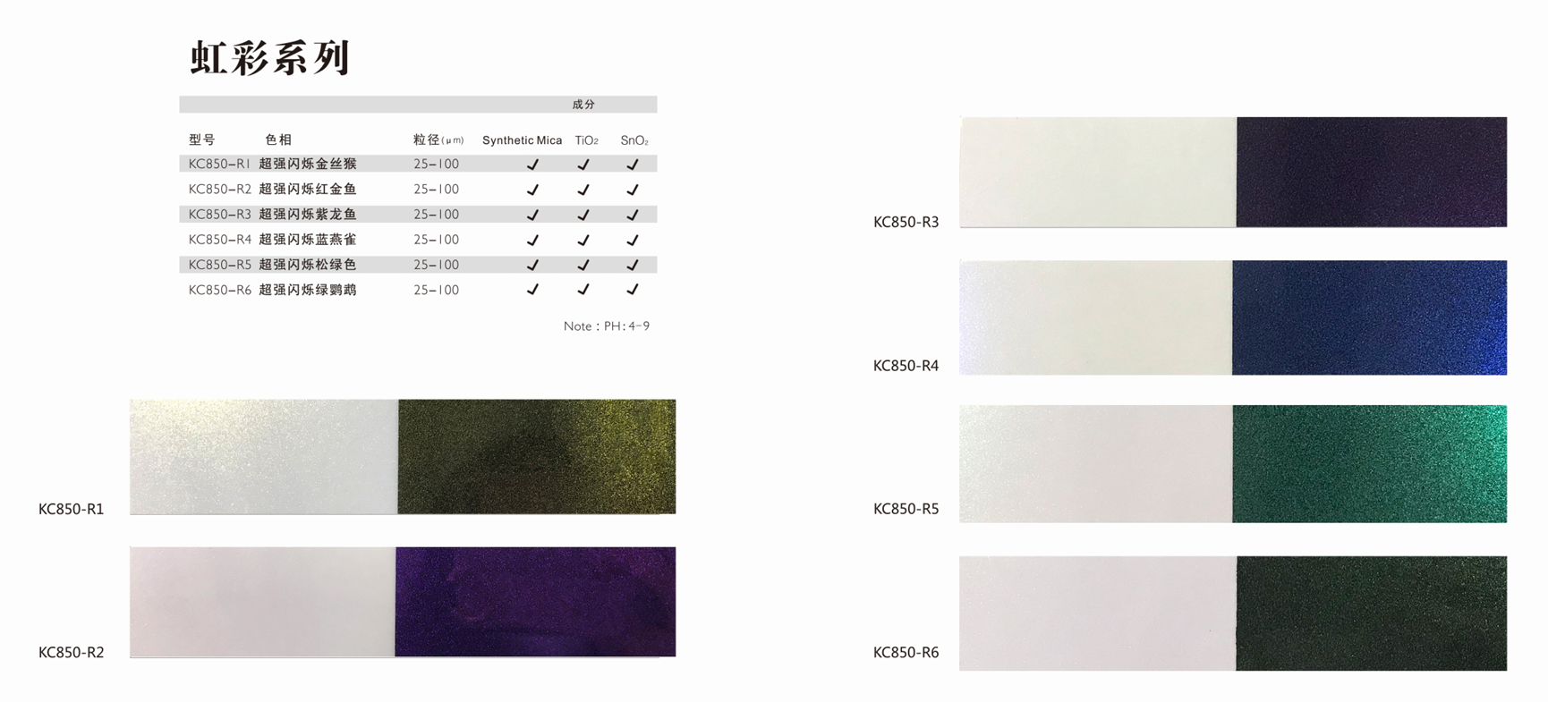 水晶龙系列珠光颜料具有超高的色彩饱和度,明亮耀眼的超强闪烁感,精密的包膜工艺,优良的分散性能。